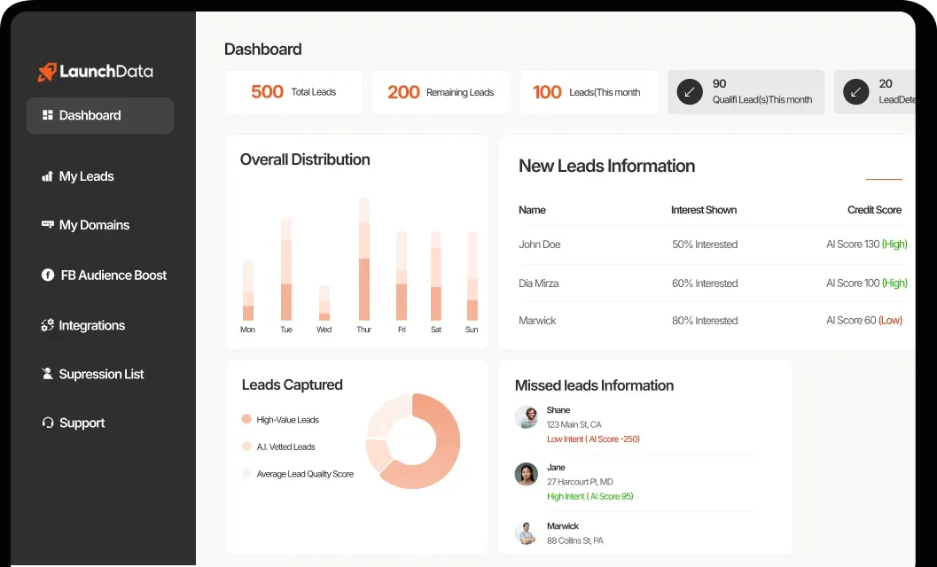 LaunchData makes it easy to save and start marketing to motivated leads. Plus, our lead management tool lets you exclude previous leads and stack filters (e.g., divorcees and preforeclosures) for more niche leads, and search by address, zip code, city, or county—ensuring you never miss an opportunity.